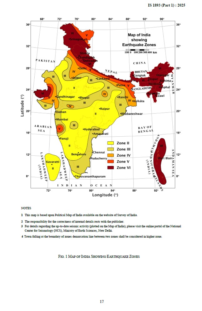 The Bureau of Indian Standards (BIS) has published IS 1893 (Part 1): 2025, wherein the earthquake zoning of the country has been updated. As per the revised standard, the entire geographical area of India has now been categorized into five seismic zones, namely Zone II, Zone III, Zone IV, Zone V, and Zone VI.
